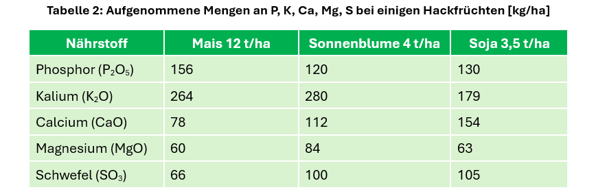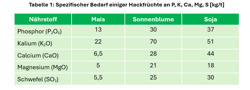 Allerdings nimmt nicht unbedingt die Pflanze die größte Nährstoffmenge auf, die den höchsten spezifischen Bedarf hat – zumindest können sich die Verhältnisse zwischen beiden verändern. Die Gründe dafür liegen in unterschiedlichen Erträgen, verschiedenen Haupt- und Nebenproduktanteilen sowie in unterschiedlichen Nährstoffaufnahmezonen.
