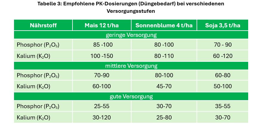 Wenn der Phosphor- und Kaliumbedarf nicht gleichzeitig mit einem bestimmten NPK-Dünger gedeckt werden kann, sollte man bestrebt sein, den Kaliumbedarf vollständig zu decken, ohne jedoch den Phosphorbedarf zu vernachlässigen. Ein Teil des Phosphors kann später durch Starterdüngung bei der Aussaat ergänzt werden.